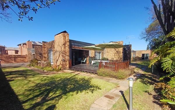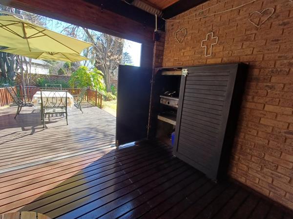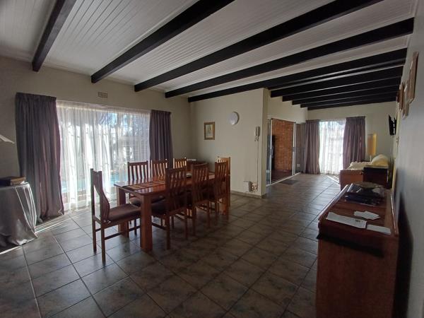 Open plan lounge and dining room leading off to an enclosed patio overlooking the deck and swimming pool and well-maintained garden with garden sprinklers