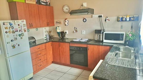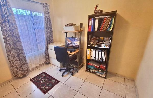 Inside, the 109m2 floor plan features a spacious lounge with tiled flooring and ample natural light, flowing seamlessly into the dining area. The functional L-shaped kitchen is equipped with wood-look cabinetry, granite-style countertops, a built-in oven, an electric hob, and a double sink, complemented by practical tiled floors and backsplash. A dedicated study provides a quiet space for work or hobbies.