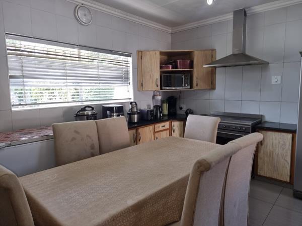 Partially renovated, the home features beautifully refreshed living areas, including a large modern kitchen, dining room, and two lounges, all enhanced by unique light fixtures and ambient lighting that create a warm, welcoming atmosphere. The kitchen is the true heart of the home, offering granite countertops, ample cupboard space, and a free-standing oven and stove, with enough room for a 6-seater dining table ideal for family meals and entertaining.