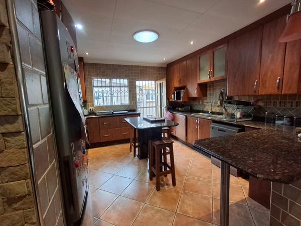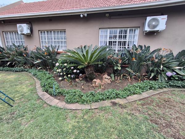 A delightful home nestled in a beautiful manicured garden. You will find a spacious lounge/TV room, stylish big kitchen with gas hob and plentyful cupboard space and three comfortable bedrooms (main-en-suite). The enormous luxurious bathrooms are crisp and modern, and the large sunken dining room opens into the entertaining area. The thatched lapa is large enough for small functions with a built-in-braai and own guest loo. All this is comfortly situated alongside the pool. This property also offers a separate laundry room, and spacious staff quarters with ablution - easily convertable into a garden cottage with own entrance. It also has a double garage with automated doors and a double carport, and extra parking for your guests. PLEASE NOTE: 2 X GAS GEYSERS FOR THE MAIN HOUSE, AND 1 X GAS GEYSER FOR THE OUTBBUILDING. A must on your viewing list!