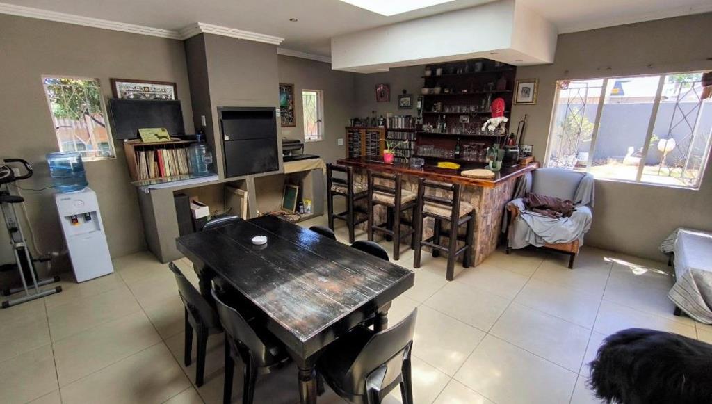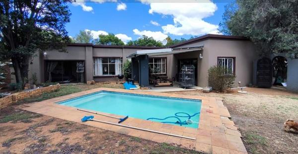 Enjoy multiple living areas including a tiled lounge with fireplace, a dining room, and a large entertainment room with built-in braai, bar, patio, and pool. The kitchen offers ample storage, with a scullery and laundry for added ease.