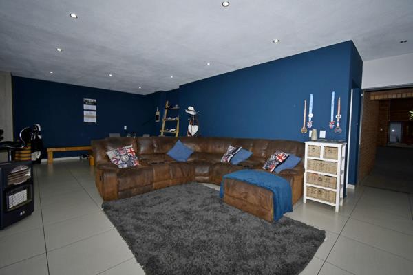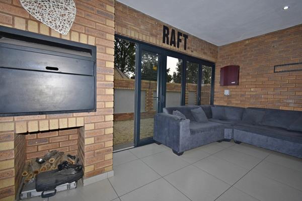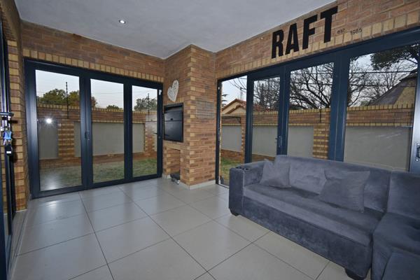 Upon entering, you are welcomed by a grand entrance that leads to a spacious lounge combined with a dining room. From the reception area, a sliding door opens to a covered patio with a built-in braai and a private garden featuring artificial grass and a tiled walkway.