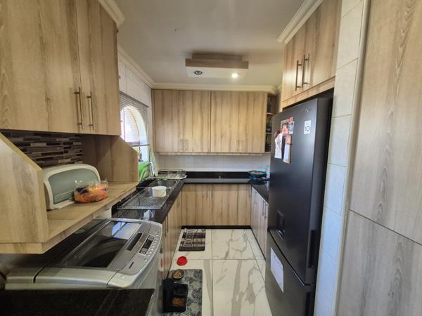 Discover this inviting 4-bedroom, 3-bathroom family home situated in the desirable suburban area of Brackenhurst, Alberton. Upon entering through the entrance hall, you are greeted by spacious living areas, including two lounges and a dedicated dining room, all featuring modern, large-format tiled flooring. A highlight is the family TV room, boasting an exposed brick accent wall and extensive built-in display cabinetry, perfect for entertaining or showcasing collections.