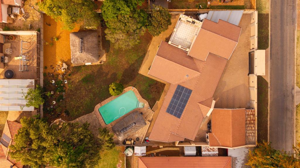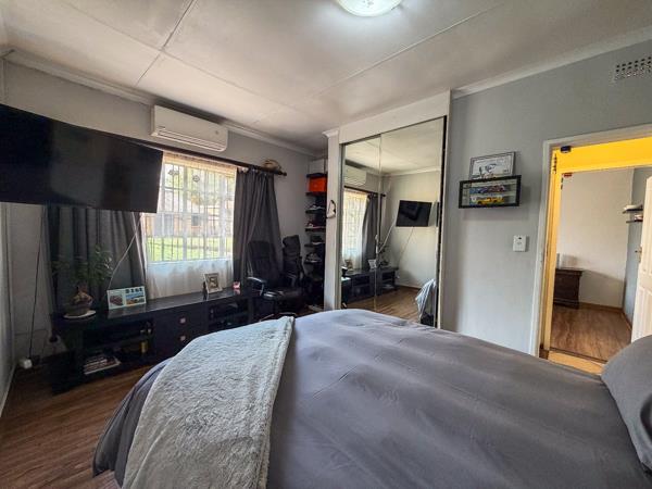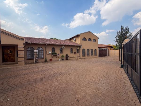 Security is paramount, with features including an alarm system, electric fencing, security gates, burglar bars, all within a totally walled perimeter. The home is also equipped with modern sustainability features such as 12 solar panels and an 8.5KvA battery inverter, ensuring energy efficiency and backup power. There is an additional generator change over switch. Air conditioning adds to the comfort.