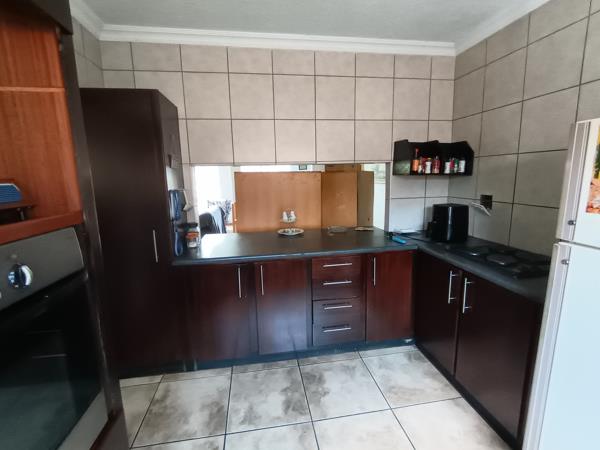 *Kitchen: The fully tiled kitchen is thoughtfully laid out with dark wood cabinetry and a functional design, including space for a washing machine and a double fridge.