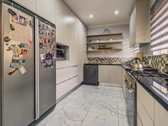 The modern, chef-inspired kitchen is a standout, featuring sleek cabinetry, ample counter space, and an eat-in counter. The kitchen effortlessly flows into the open-plan dining and lounge area, with glass sliding doors opening onto a large entertainment lapa. Perfect for hosting gatherings.