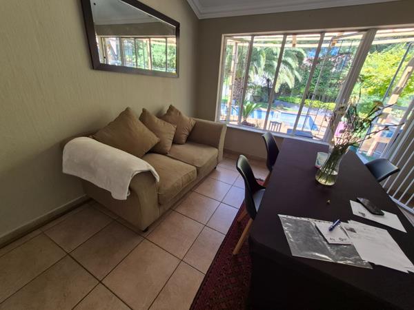 Outdoor living is a highlight of this property, boasting a refreshing swimming pool, perfect for warm South African days. The established garden offers a green oasis, while extensive paving ensures low maintenance and provides ample space for outdoor activities. With two garages and an additional six open parking spaces, vehicle accommodation is exceptionally generous. The property is totally walled, ensuring privacy, and pets are allowed.