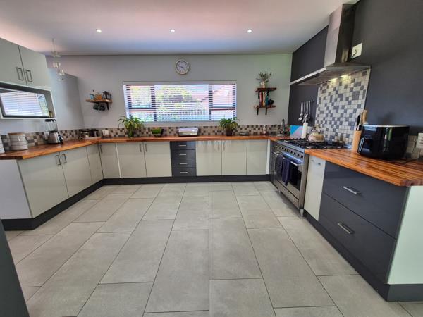 Large kitchen with wooden countertops, 5-plate gas stove, extractor fan, and blinds