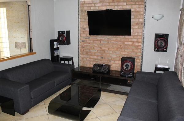 The expansive living and entertainment areas are a true highlight, featuring a distinctive brick accent wall that frames a large mounted television and a comprehensive sound system, perfect for cinematic experiences. Plush dark grey sofas and sleek black furniture create an inviting atmosphere, while tiled flooring ensures effortless maintenance. The elegant dining area, boasting a modern black glass-top table and quilted chairs, flows seamlessly through large patio doors to an outdoor space, ideal for al fresco dining and entertaining.