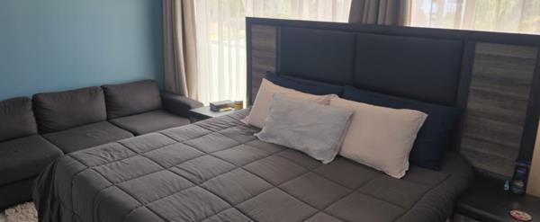 The residence boasts two serene bedrooms, each a private sanctuary. The primary suite is a testament to luxurious comfort, featuring a grand bed with a stylish dark grey and wood-paneled headboard, complemented by an integrated sitting area with a spacious dark gray sectional sofa. Natural light streams through a large window, enhancing the calming blue accent wall. The second bedroom, thoughtfully designed, includes a practical bunk bed and built-in wardrobes, catering perfectly to younger occupants. The home offers 1.5 bathrooms, featuring a sleek enclosed shower, a separate guest toilet, and a main bathroom with a pristine bathtub, all finished with elegant tiling.