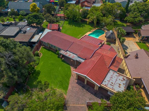 An expansive entertainment area with built-in braai leads out to a beautifully landscaped garden featuring ambient lighting, a sparkling pool, Lapa, and two Wendy houses, ideal for relaxed family living and entertaining.
