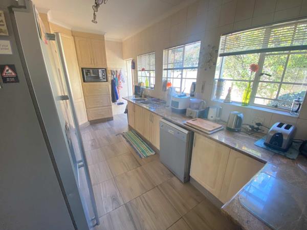 The open-plan lounge and dining area create a welcoming flow, leading into a modern kitchen fitted with granite countertops, ample cupboard space, and room for a fridge, dishwasher, and washing machine. A gas stove adds convenience during load shedding.