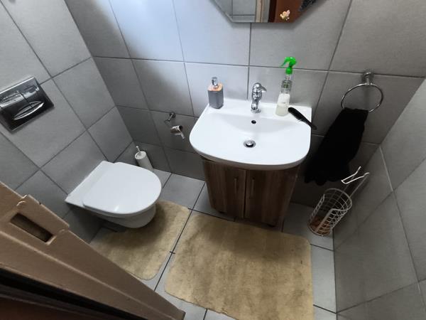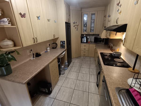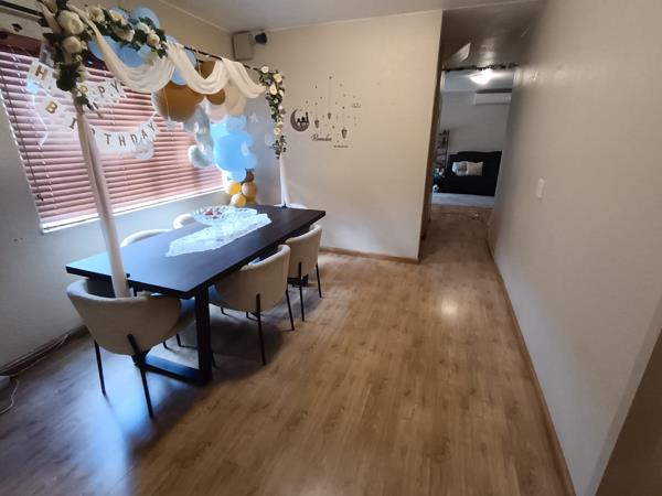 The guest toilet is situated at the entrance leading to a laminated separate dining room. The kitchen is private with plenty of cupboard space and melamine counter tops with a double sink. The laundry is situated in the open air just outside of the kitchen security door perfect for a tumble dryer and top loader washing machine. The dining room leads to separate lounge with aircon, corner showpiece and TV stand. There is a carpeted study with shelves, could be used as 4th bedroom, just need to install cupboards. The sliding doors in the lounge lead to a neat garden with a covered patio area for entertaining.
