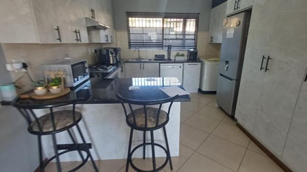 There are three well sized bedrooms with laminated floors and built in wardrobes. Enjoy the two sparkling bathrooms where one is an ensuite to the main bedroom for privacy and convenience. The modern kitche has finishes of granite counter tops and is equipped with breakfast nook, hob, under counter oven and built in cupboards. The open plan is the central part of this home with large lounge and dining area.