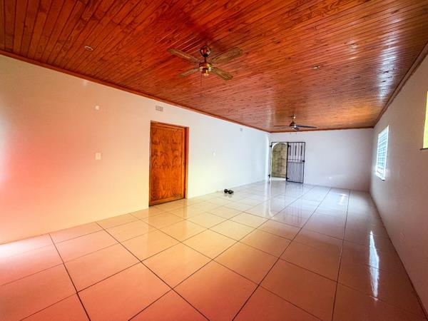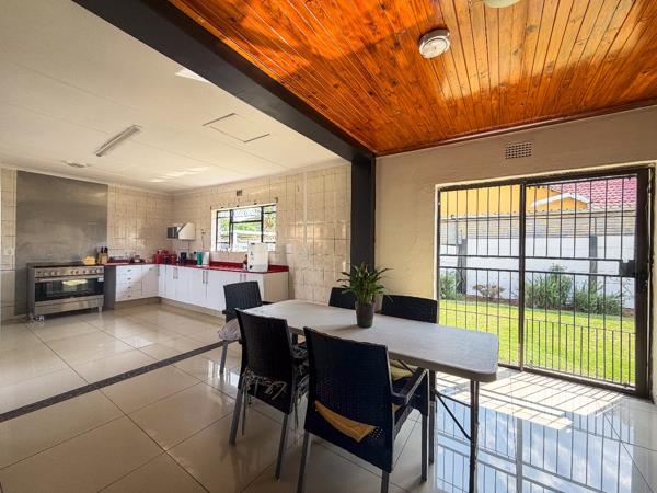The kitchen opens onto a large garden complete with a thatched lapa which could be completed and used as a separate flatlet or entertainment area.