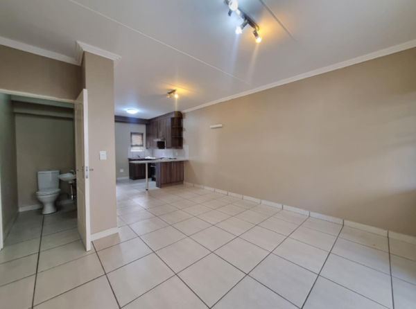 This duplex unit features an open plan design lounge and kitchen with electric stove, oven, extractor fan and built in cupboards. Sliding doors from the lounge lead out to a private patio where you can enjoy a braai with loved ones. A downstairs guest toilet is an added convenience.
