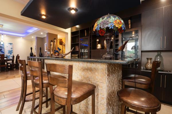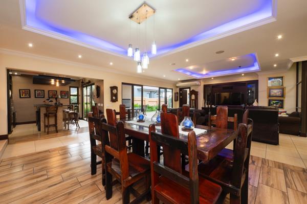 An elegant open plan living area that contains a stunning dining room which extends onto the lounge area. A bar area with sliding aluminium doors which open onto a private outdoor patio, and an inviting pool creating a seamless harmony between indoor comfort and outdoor tranquillity.