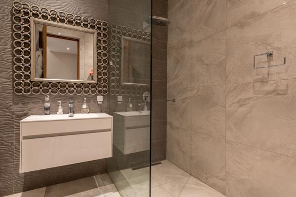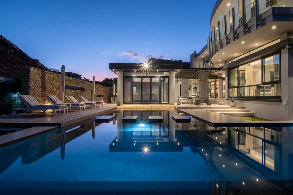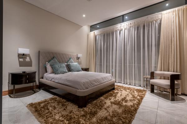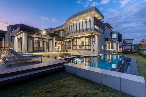 A seemless indoor outdoor flow takes you from inside perfection and class to outdoor paradise with eat out dining, boma, built in gas braai, outdoor elegant bathroom with shower and toilet, outdoor cinema and entertainment area with surround sound and projector screen where door stacks open to a beach entry to infinity swimming pool surrounded by rolling green lawns.