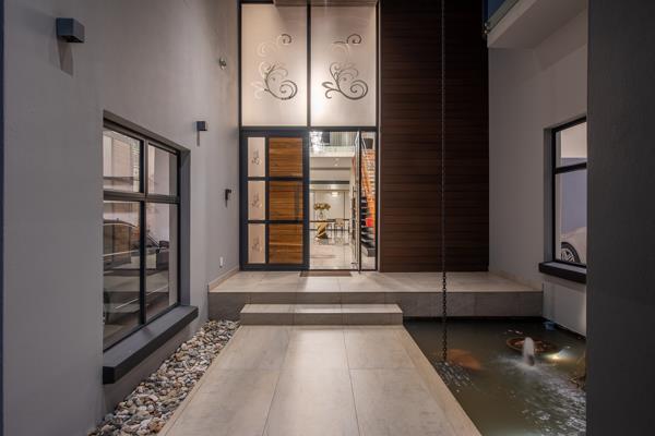 A guest powder room/guest loo, guest bedroom en-suite, TV lounge with blue marble feature wall looking out to gorgeous landscaped gardens, open plan dining bar, living area with a well positioned fireplace for seperation. World class and gourmet chefs kitchen with miele deep fryer, griller, gas stove, oven, microwave complimented with scullery and pantry round off the ground floor living features.