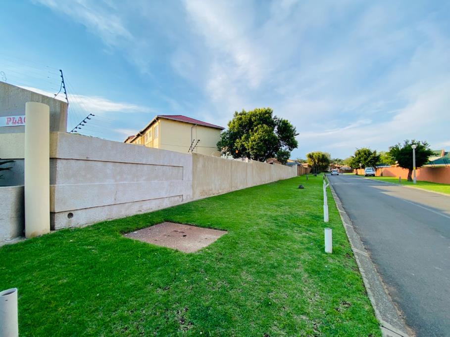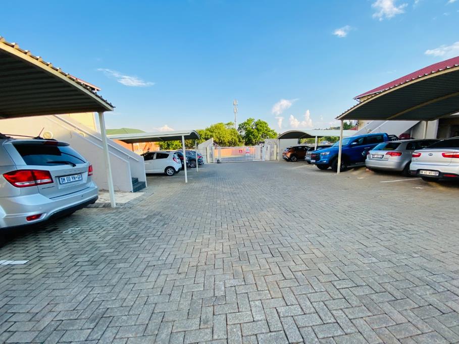 Security is paramount in this complex, featuring a gated entry with electric fencing and robust security walls, ensuring peace of mind. Residents benefit from a dedicated covered parking bay within the secure premises, accessible via a paved driveway. The complex entrance is neat, with an organized mailbox system and clear signage, contributing to a welcoming first impression. The surrounding area presents a well-maintained green verge, adding to the pleasant environment.