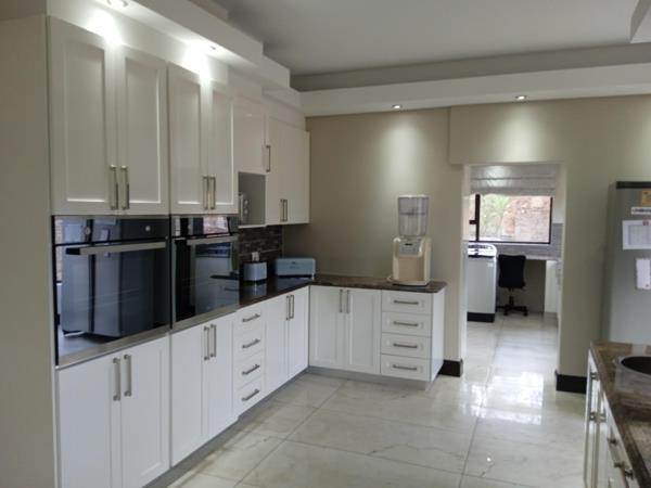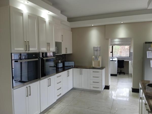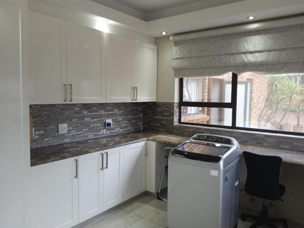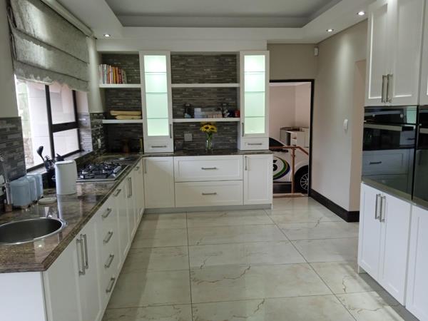 The modern and stylish state of the art kitchen features exquisite finishes ample cupboard space , gas hob , eye-level oven, pantry, a separate scullery, and a separate large laundry area for ultimate convenience