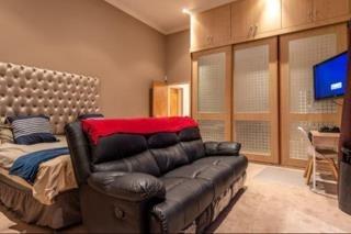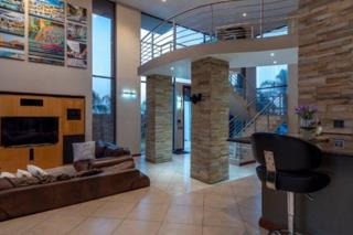 This property has a magnificent oak wood themed kitchen with Caesar stone countertops. The kitchen also includes high end appliances, a scullery and a laundry area perfect for all your culinary needs. This exquisite home boasts a cozy open plan lounge area with high ceilings, a modern styled dining room equipped with a gas fireplace suited to all your entertainment requirements. This also leads you to the massive built-in bar, under the sun swimming pool and expansive patios.
