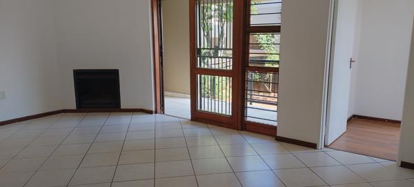 An open-plan lounge featuring a fireplace, perfect for cozy winter evenings. The lounge opens onto a patio with a built-in braai and a private garden.