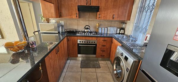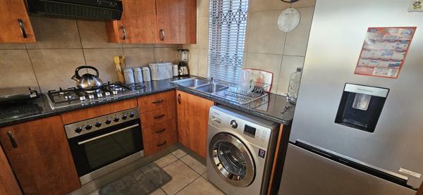 This ground floor unit is spacious and boasts a large open plan lounge and kitchen with granite tops, a gas hob, space for 2 appliances and ample cupboard space. There are 2 well sized bedrooms with built in cupboards and 2 bathrooms (MES).