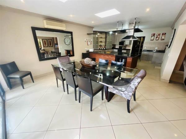 Beyond the interiors the property unfolds into a captivating outdoor oasis. A spacious patio, sparkling swimming pool and meticulously maintained garden create an idyllic setting for relaxation and entertainment. The built-in braai and dedicated braai room promise memorable gatherings. Practical amenities include three garages, five additional parking spaces, a paved driveway and staff accommodation. This pet friendly haven is entirely walled offering peace of mind.