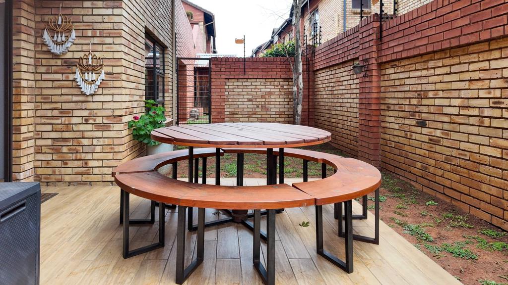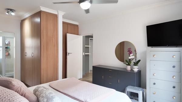 This home offers two well-appointed bedrooms and two modern bathrooms, including a guest toilet. Bedrooms feature ample built-in wooden wardrobes, with one benefiting from an ensuite bathroom and a walk-in closetdressing area. The contemporary bathrooms boast walk-in showers and vanities. Embrace outdoor living with a private patio, wooden deck, small garden, and a dedicated braai room. The complex also provides a communal pool for residents.