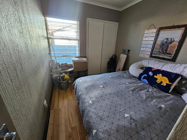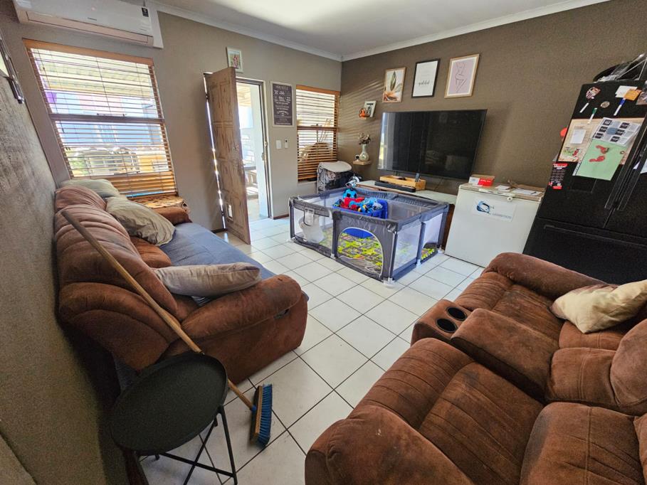Large open plan Lounge with air conditioner and opening onto covered Patio with build in braai.