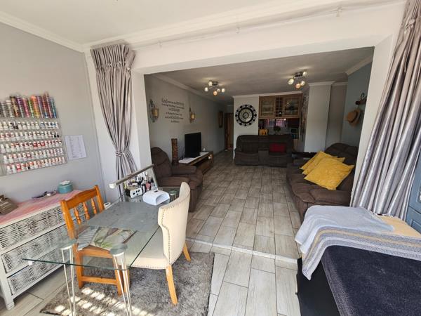 Large open plan tiled Lounge and Dining room opening onto patio overlooking garden.
