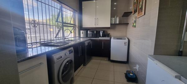 The welcoming entrance hall leads into spacious living areas, including a comfortable lounge and dining room that flow out to an entertainment patio with a built-in braai and garden area perfect for hosting family and friends. The beautifully designed kitchen features granite countertops, a gas stove, electric oven, and a convenient laundry area.
