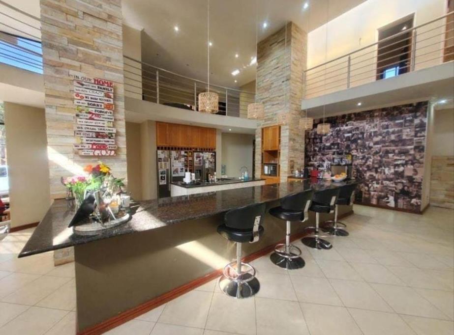 Discover this exceptional modern residence in the sought-after suburb of Meyersdal, Alberton, South Africa, offering a blend of sophisticated design and comfortable living. The property boasts a striking multi-level architectural design with high and double-volume ceilings, creating an expansive and airy atmosphere throughout. The open-plan layout seamlessly connects the living spaces, featuring elegant stone accent walls, a contemporary fireplace, and a built-in bar area perfect for entertaining. A spacious kitchen with a large island forms the heart of the home, complemented by a dedicated dining room and a family TV room, ensuring ample space for relaxation and social gatherings. A study provides a quiet retreat for work or contemplation.