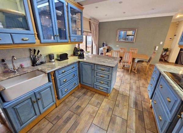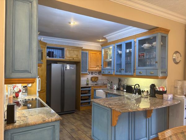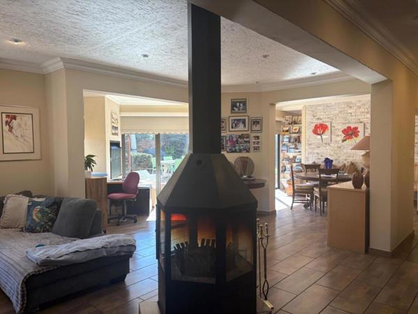 Double wooden doors that open onto a spacious lounge, a cozy family room, elegant dining area and a unique kitchen with scullery ,all centred around a charming fireplace and build in indoor braai area surrounded by Stacking doors which lead out to the well maintained garden and sparkling pool, creating an inviting indoor-outdoor lifestyle ideal for entertaining.