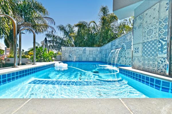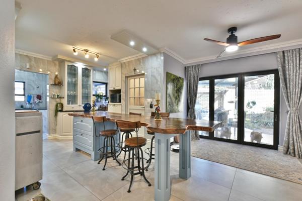 The heart of the home is its gourmet kitchen, which includes a central island, separate scullery, and walk-in pantry. Additional premium touches include underfloor heating, air-conditioning throughout, a cozy fireplace, and a heated fiberglass swimming pool nestled in a beautifully landscaped private garden with irrigation and a borehole.