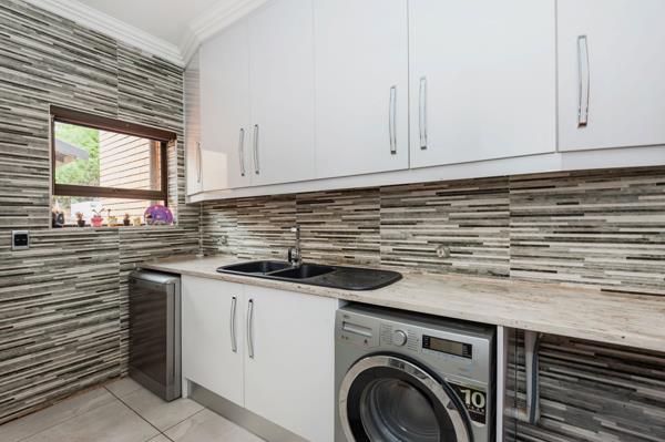 The spacious, modern kitchen is equipped with a freestanding stove with a gas hob and electric oven, separate double electric eye-level ovens and a prep bowl. It offers ample counter space and an abundance of high-gloss cabinetry. A sizeable scullery with space for four undercounter appliances is neatly tucked behind the kitchen and provides convenient access to both the garage and back garden. The dining room is within proximity to the kitchen. Here you can enjoy a family meal whilst listening to the calming sound of a nearby, flowing water feature.