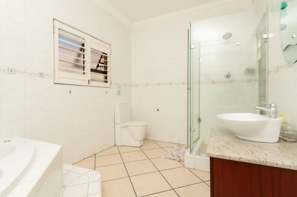 This residence comprises four well-proportioned bedrooms, each designed for comfort. Two bedrooms feature modern laminate flooring and built-in wardrobes, with ceiling fans providing climate control. The three bathrooms are thoughtfully appointed, offering a mix of separate glass-enclosed showers, corner bathtubs, and modern vessel sinks set on granite-topped vanities, ensuring convenience for the entire household.