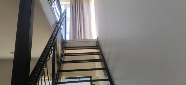 Step inside to discover a thoughtfully designed interior featuring a comfortable lounge area and a functional kitchen. The multi level layout is enhanced by a modern metal staircase and benefits from ample natural light creating a bright and inviting atmosphere. Clean white walls and contemporary laminate flooring contribute to a fresh aesthetic throughout providing a versatile canvas for personal touches.