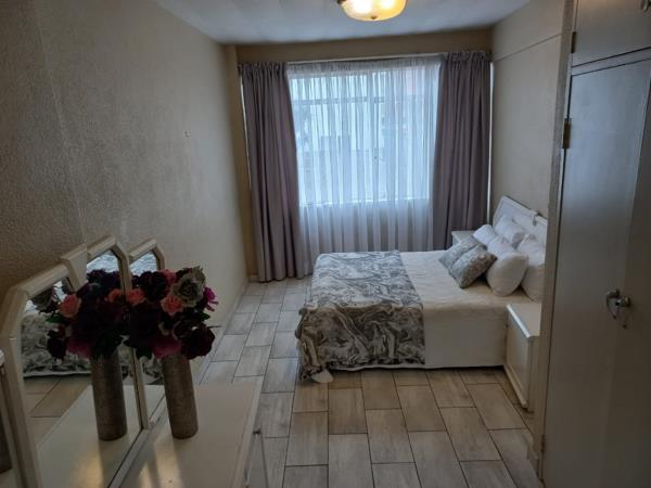 It is a corner unit on the first floor of the building. You enter into a large lounge. The kitchen is well fitted and also a good size. There is one spacious bedroom with double cupboards. The bathroom is neat with a bath, basin, toilet and small cupboard. The entire flat is tiled with a cream tile