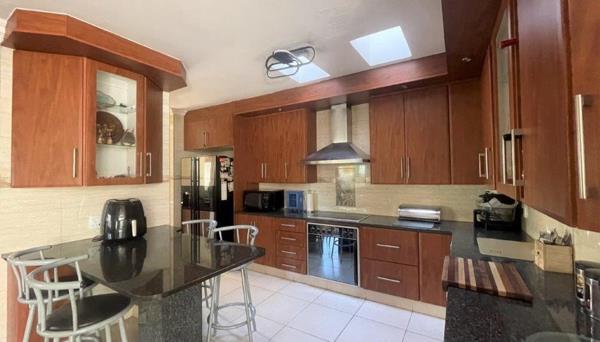 Outside there is a spacious patio with built-in braai, gas stove and beautiful cupboards with granite counter tops. On both sides of the patio is a well maintained private garden - pet friendly. BONUS - airconditioner, prepaid electricity plus this is a full title cluster home without levies. The double door garage is automated and behind the garage is an under roof paved area for motorbikes, quad bikes or storage. There is an electric fence around this home and around the complex with a security gate.