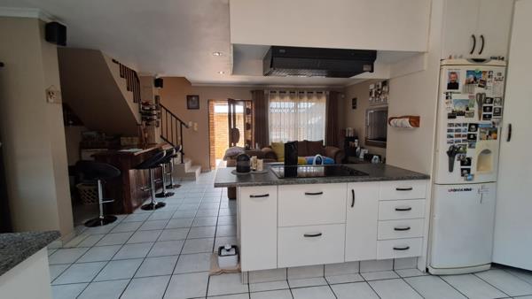 Open plan kitchen with glass top hob and extractor. From kitchen door outside small courtyard