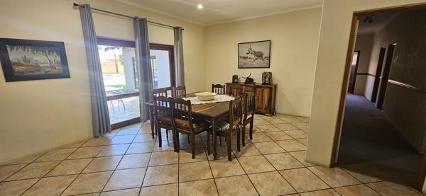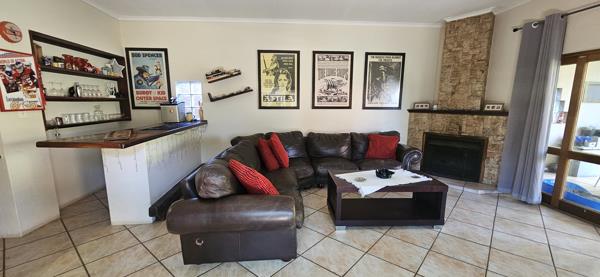This home features an open plan dining room, big lounge with a bar counter and kitchen with a breakfast nook, ample cupboards and a gas hob. Beautiful sliding doors lead to the covered patio overlooking the spacious garden with a fenced pool(not in working order).