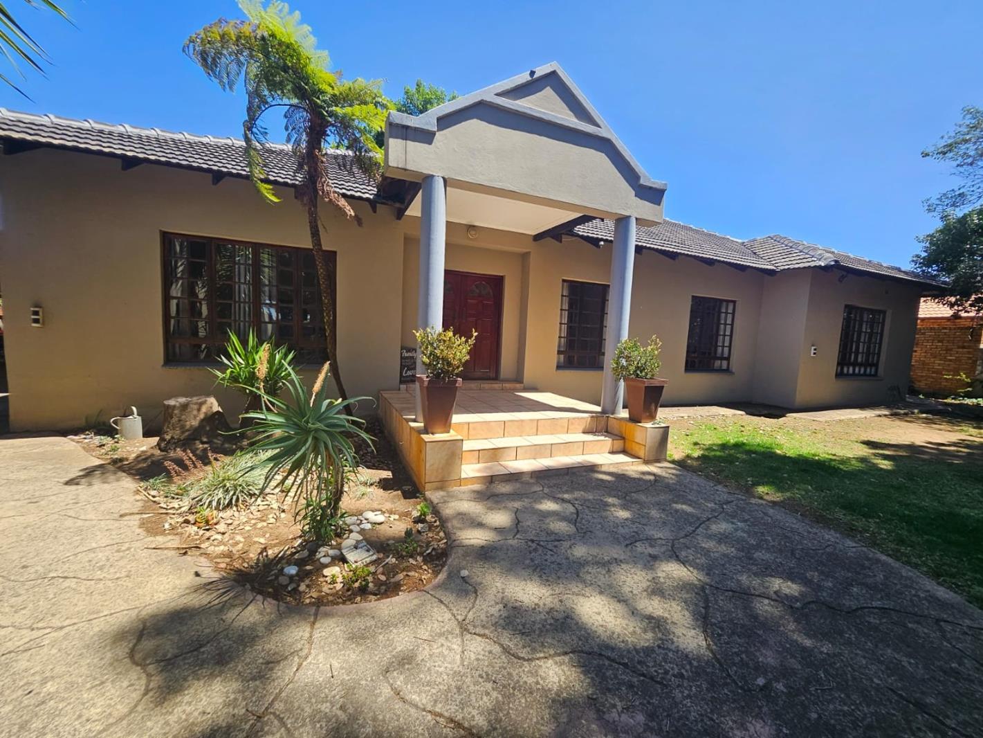 A distinguished single story residence in New Redruth, Alberton presents an immediate impression of refined elegance. The light beige exterior crowned by a classic dark tiled roof welcomes you through a covered front entrance supported by stately pillars leading to a vibrant red front door. Manicured garden beds adorned with mature succulents and a majestic palm like tree frame the approach hinting at the expansive luxury within this suburban sanctuary.
