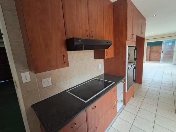 Step inside to find a spacious lounge area, brightened by large windows and equipped with tiled flooring, recessed lighting, and a ceiling fan for year-round comfort. A sliding glass door, secured with a security gate, connects this living space to an outdoor area. The functional kitchen is well-appointed with rich wooden cabinetry, dark granite-style countertops, an integrated electric hob, and a double eye-level oven. Tiled flooring and a backsplash ensure easy maintenance, while a built-in wine rack adds a touch of convenience.