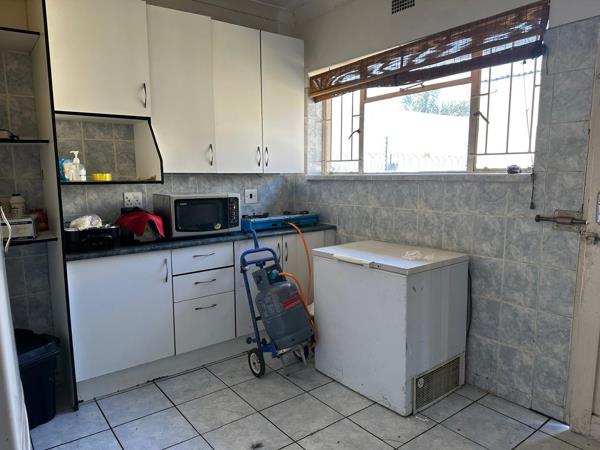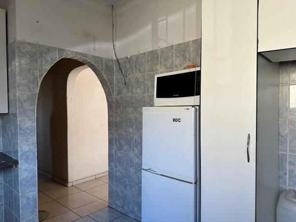 The interior presents a spacious lounge area with tiled flooring and large windows that invite ample natural light, offering a comfortable space awaiting a modern touch. The functional kitchen, while currently dated, provides a practical layout with existing cabinetry and space for appliances, ready for a complete contemporary overhaul. Architectural arched doorways add a touch of character, awaiting restoration to their former glory.