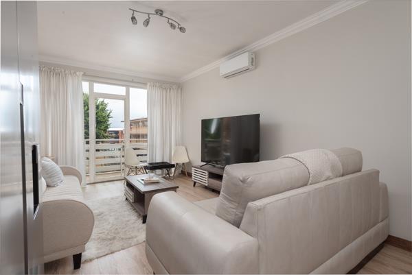 The apartment features a spacious open-plan lounge fitted with air conditioning and light wood laminate flooring throughout, creating a warm and inviting atmosphere. A private balcony extends from the living area, providing the perfect spot to unwind.
