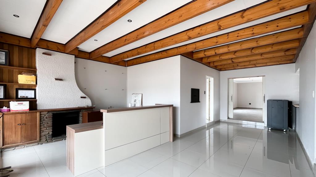 Step inside to an interior designed for comfortable living, featuring glossy tiled flooring and freshly painted light-colored walls throughout. The living spaces are bright and inviting, highlighted by distinctive exposed wooden beam ceilings and modern recessed lighting. An open-plan layout enhances the flow between rooms, including a dedicated lounge and dining area, creating a versatile environment for both relaxation and entertaining. Large windows and glass doors flood the rooms with natural light, with some areas opening to an enclosed outdoor patio.