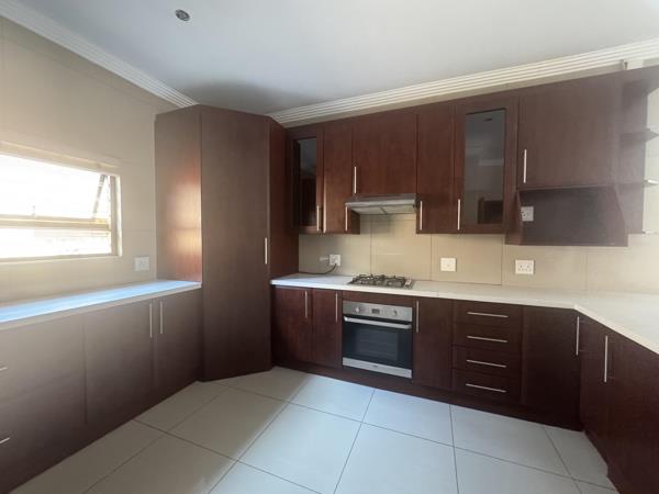 The modern open-plan kitchen is stylish and functional, complete with a separate scullery, flowing seamlessly into a spacious lounge and dining area. The living space opens onto a landscaped garden with a built-in braai, perfect for entertaining and relaxed family living. Pets are welcome.