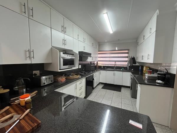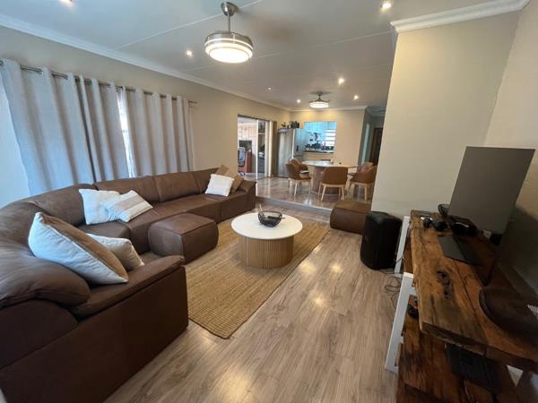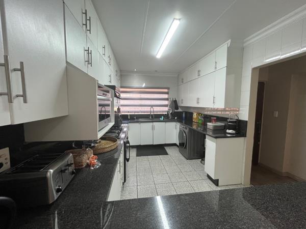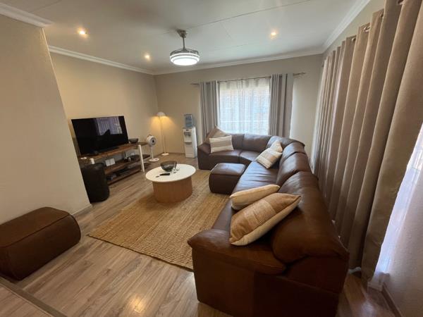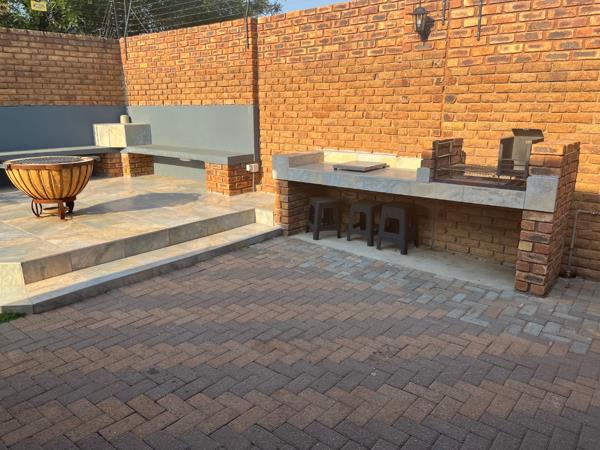 The well-appointed kitchen boasts elegant white melamine cabinetry, complemented by an under-counter oven, stove, and extractor fan, alongside provisions for a washing machine and dishwasher. A sliding door from the dining area leads to an expansive outdoor entertainment space, featuring built-in sitting benches, and Fire pit with outside lights and electric points. Close to shopping malls andamp Schools easy access to highways.